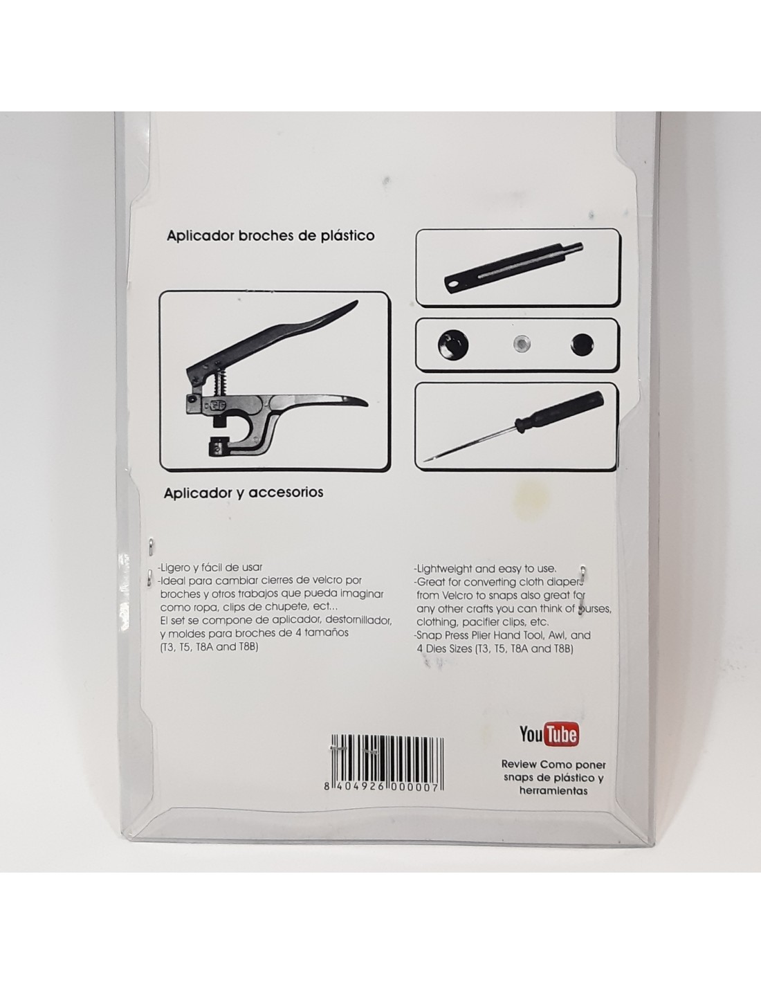 Herramienta indispensable a la hora de colocar tus broches de plástico Snaps en todo tipo de prendas y multitud de trabajos que puedas imaginar. Los moldes están disponibles en 4 tamaños : T3, T5, T8A y T8B. Puedes visualizar a través del canal de YouTube como poner los snaps.