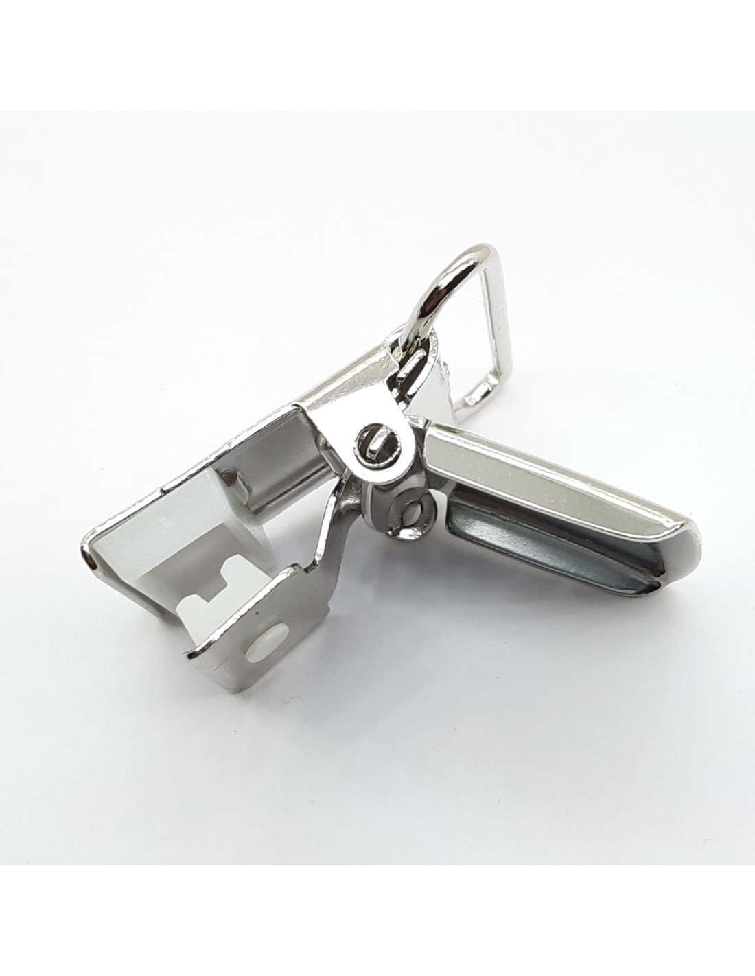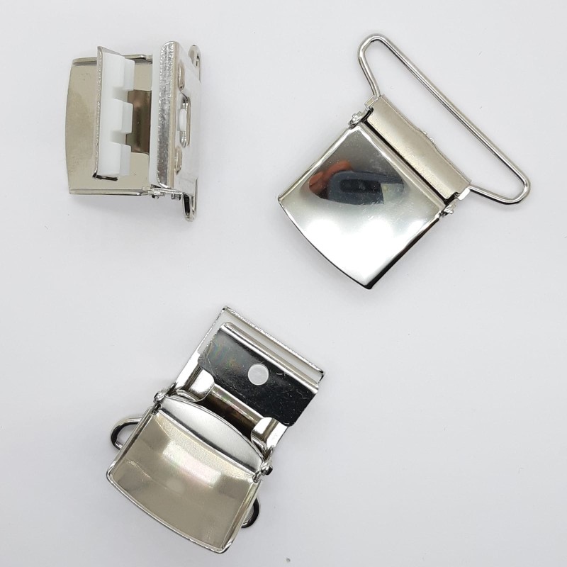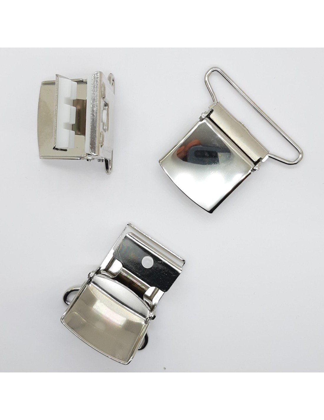 Pinza para tirantes de color níquel brillante con un ancho especial. Accesorio extrafuerte y resistente con un agarre perfecto. Accesorio ideal para cualquier acontecimiento, tanto de fiesta como casual.