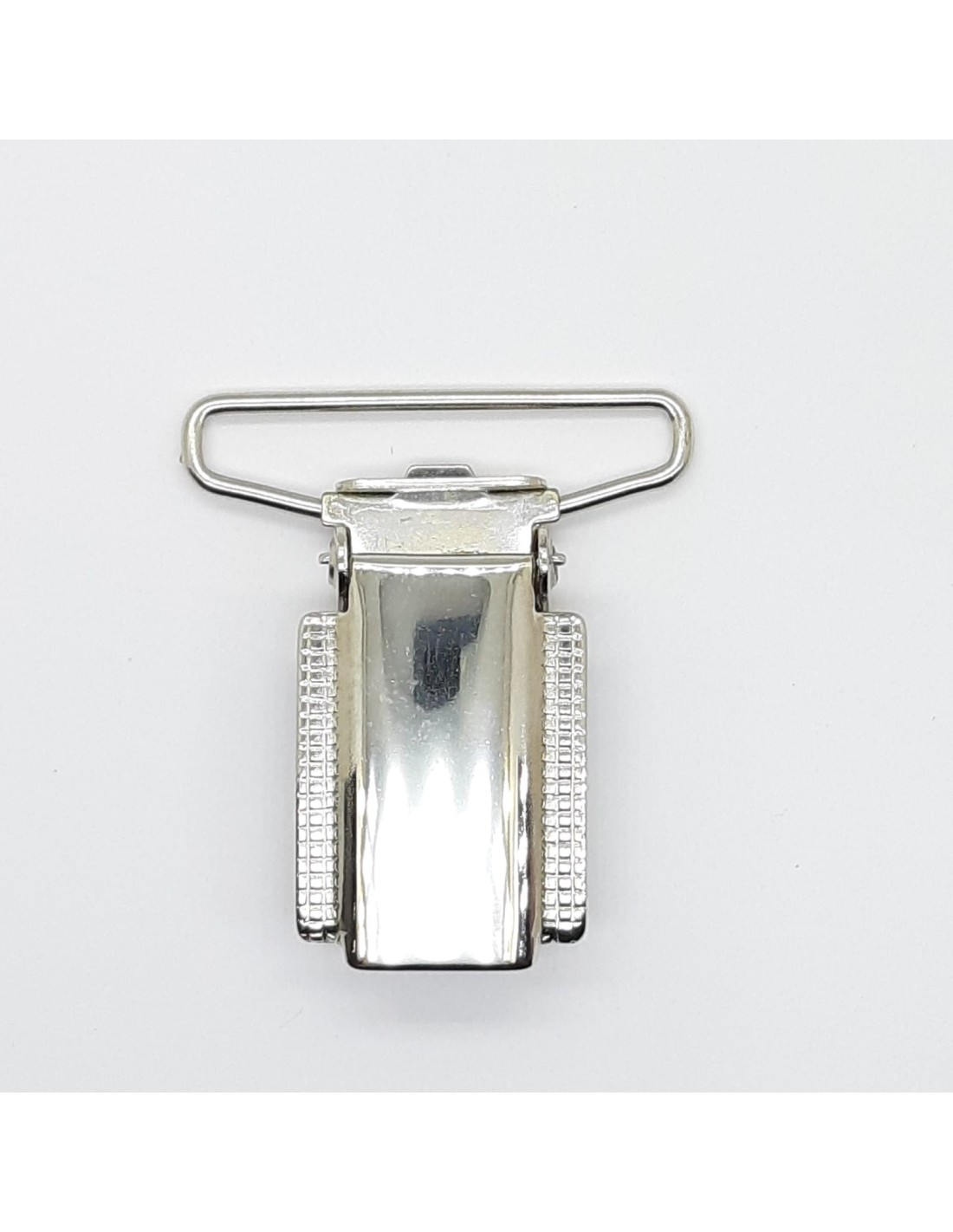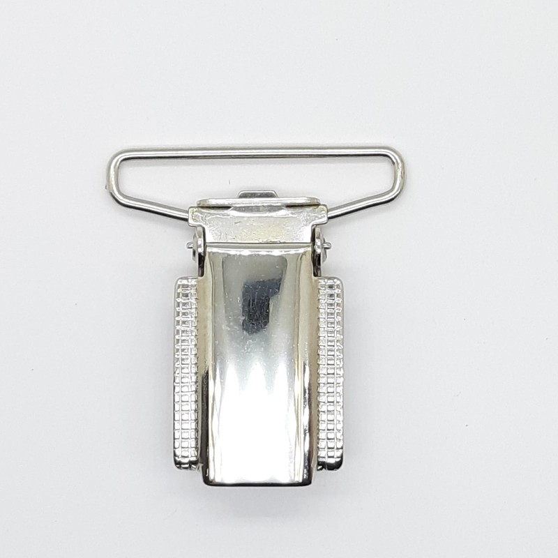 Pinza tirantes metálica de color níquel de 3 cms con alas decorativas.