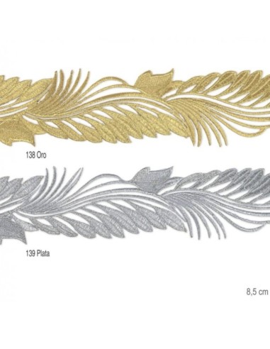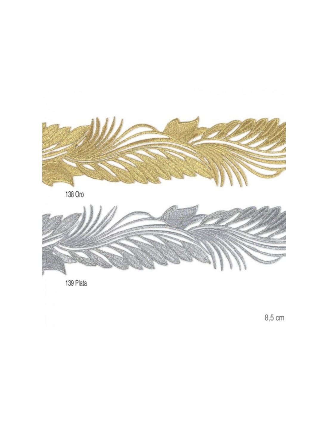 Galón Pasamanería bordado metalizado termoadhesivo oro y plata de 8,5 cm.