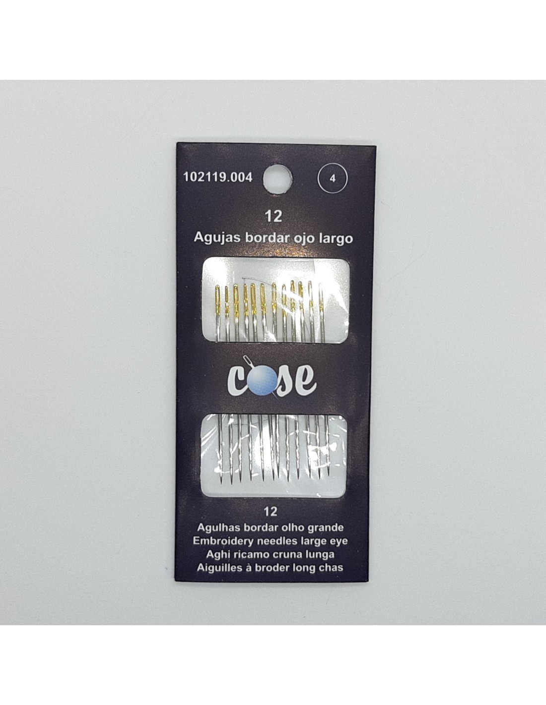 Agujas de ojo largo especial para enhebrar  nº 4. Blister de 12 agujas.