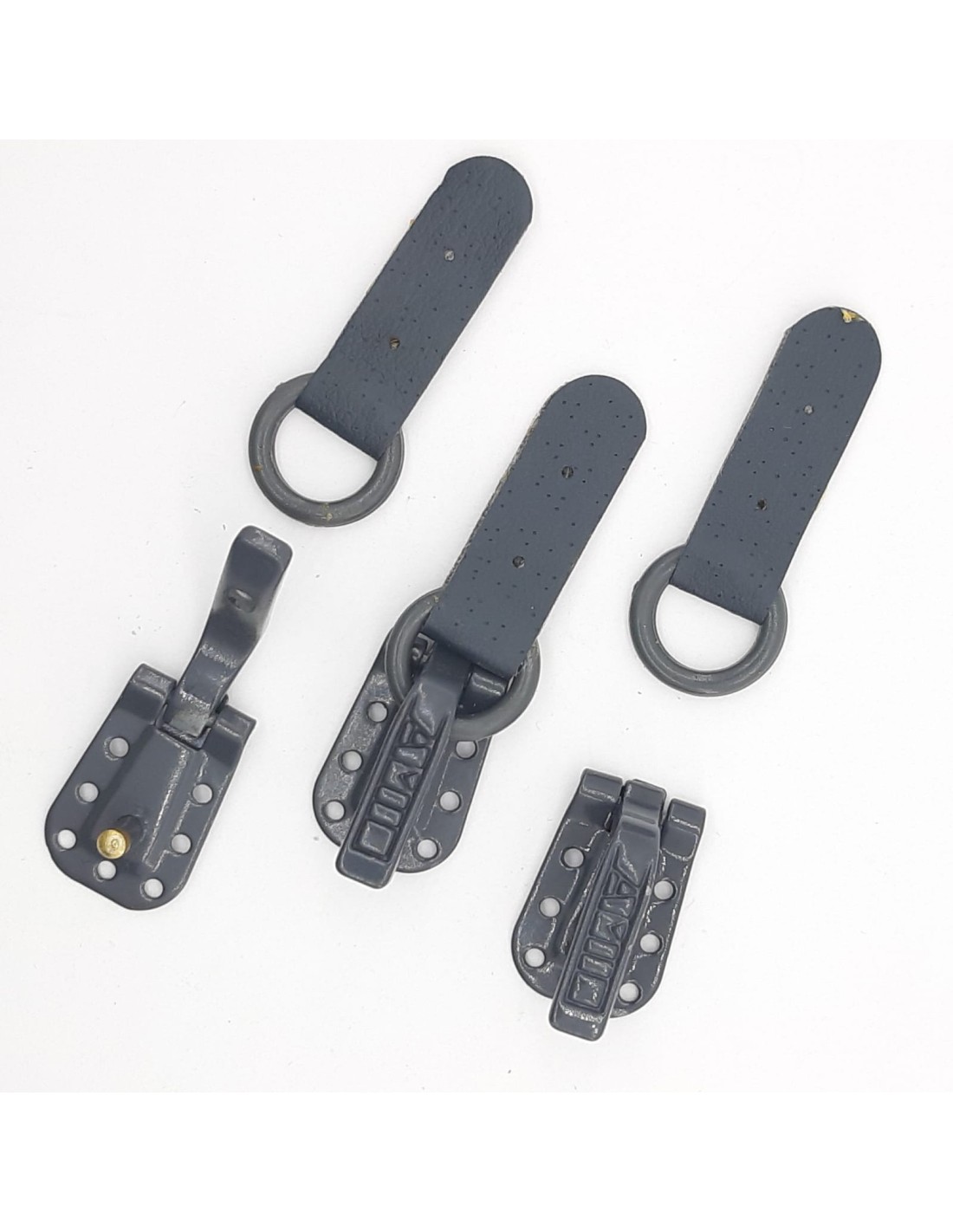 Broche peletero para coser compuesto por una pieza metálica con broche de presión y la otra por una cinta de piel con anilla.