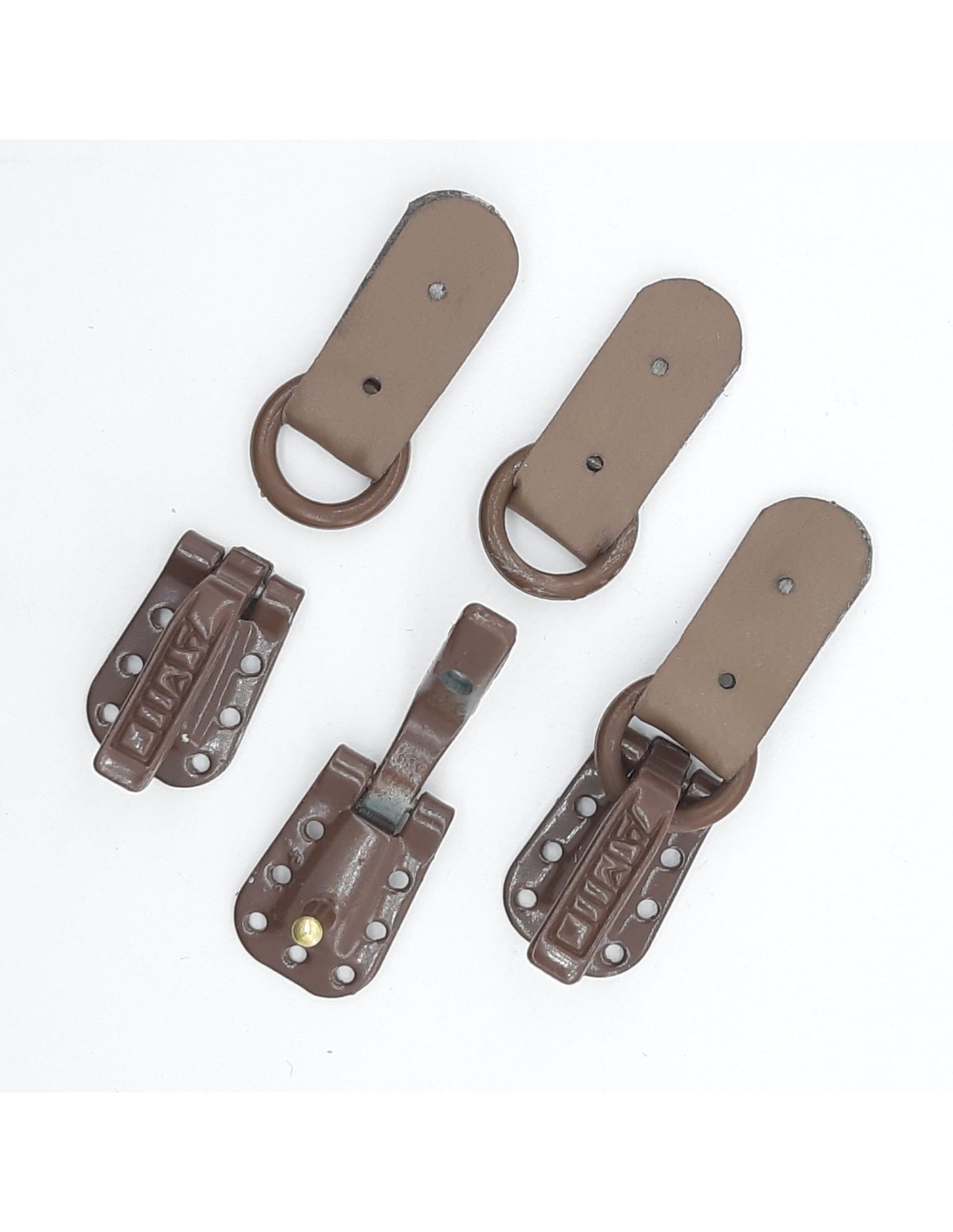 Broche peletero para coser compuesto por una pieza metálica con broche de presión y la otra por una cinta de piel con anilla.