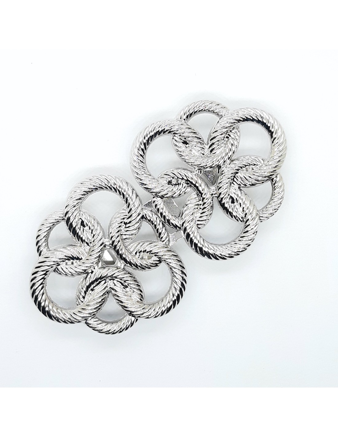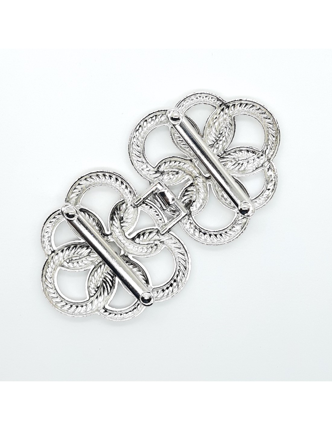 Cierre alamar metálico plateado de 25 mm. Se puede utilizar para cierre de chaquetas y cinturones. Medidas 7,5 x 4 cms