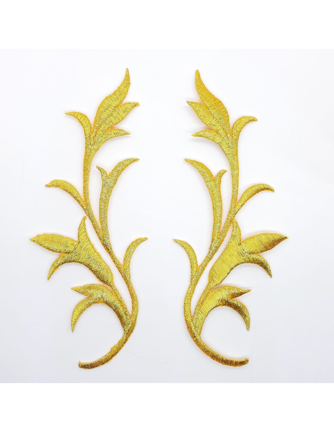 Aplicación bordada metalizada color oro. Dos piezas, izquierda y derecha de 5 x 12,7 cms con un brillo y diseño especial.