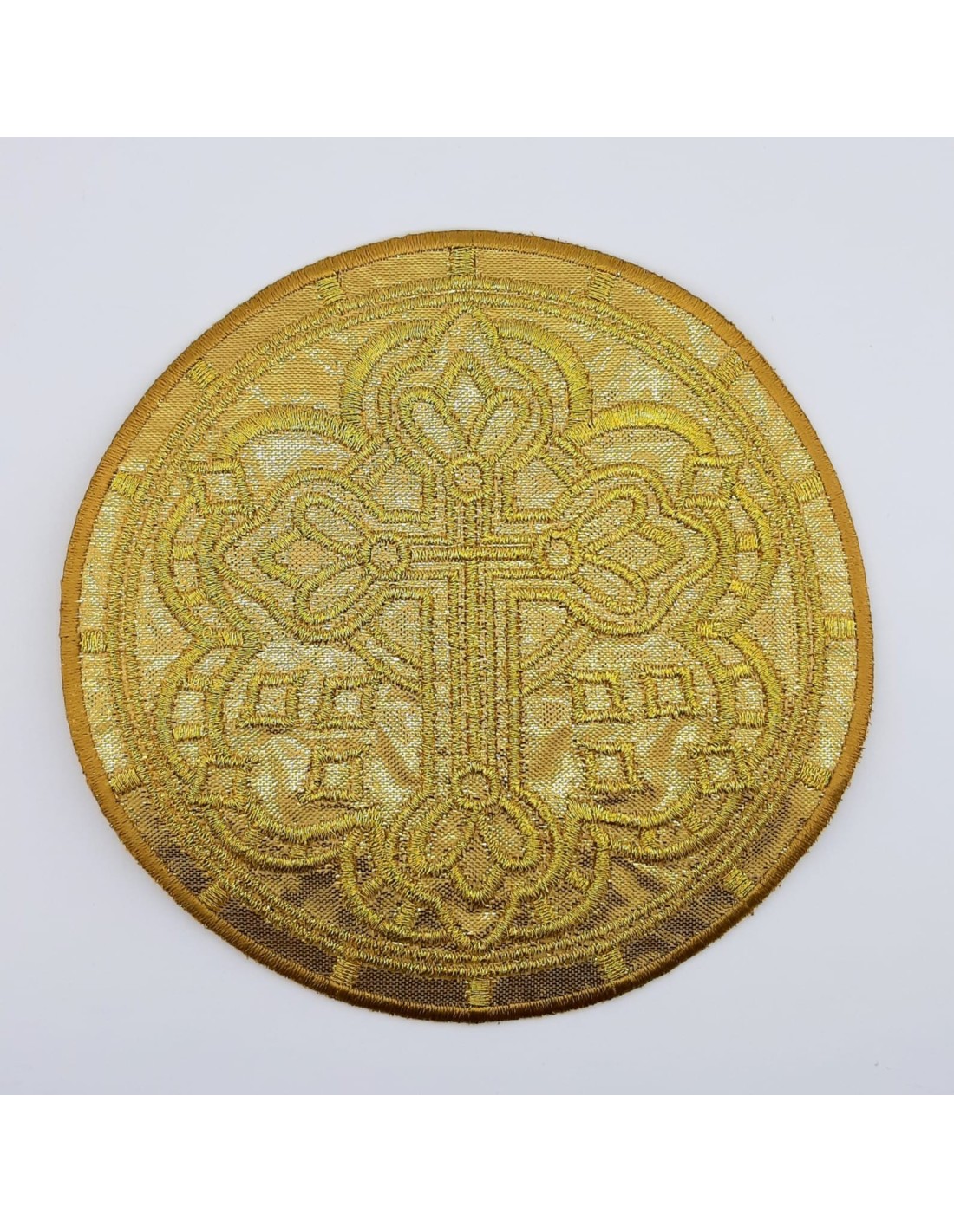 Motivo circular dorado termoadhesivo eclesiástico de 12 cms metalizado. Aplicación con dibujo de cruz.