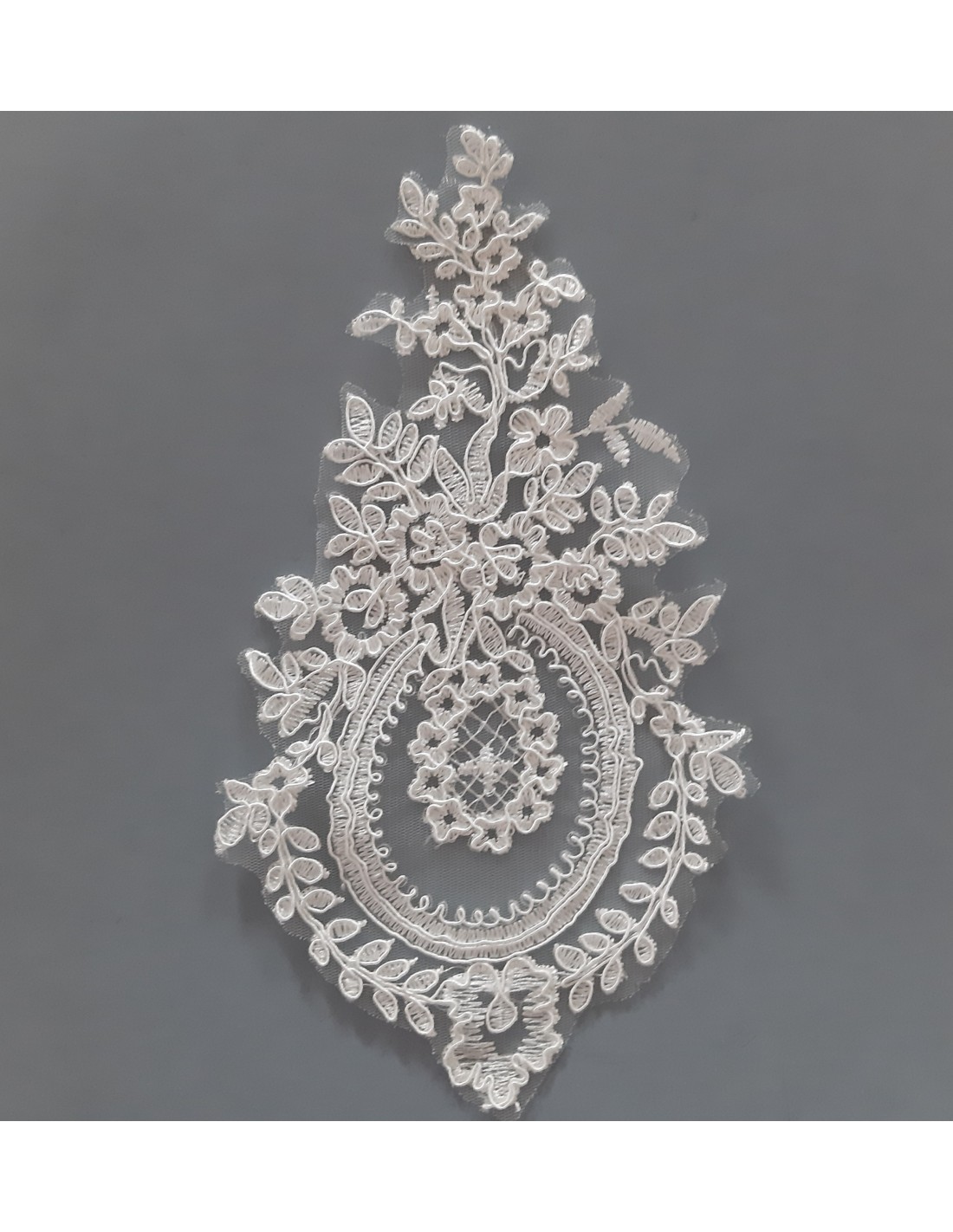 Aplique bordado en tul color blanco roto de 28 x 16 cms.