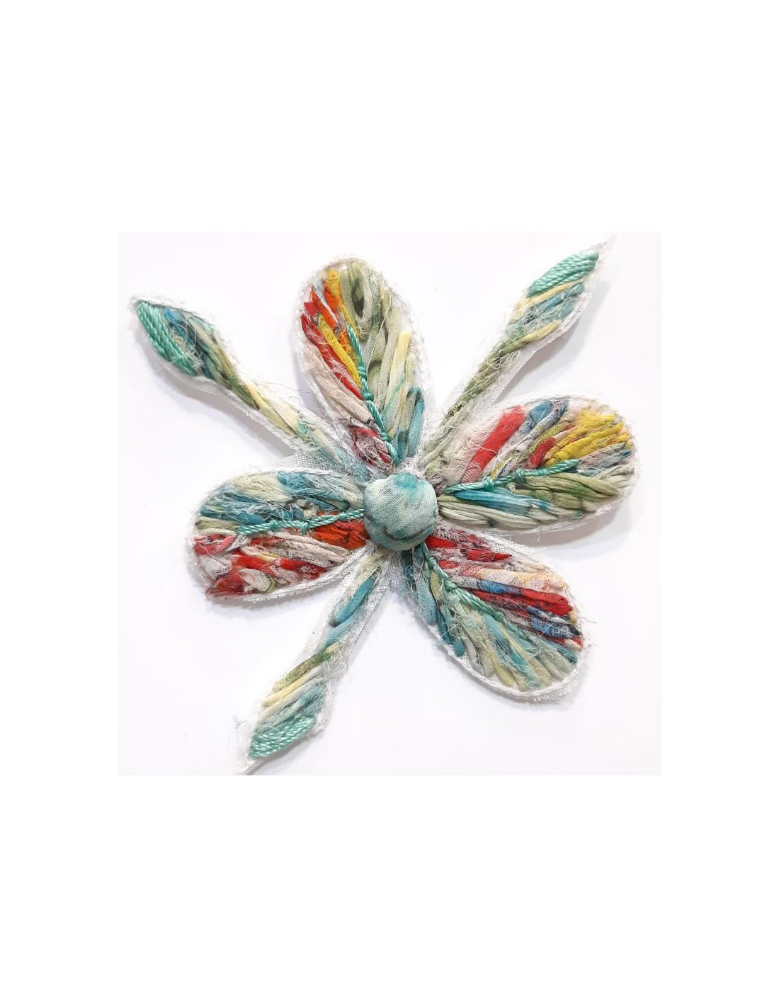 Flor de tela multicolor. Adorno ideal por su diseño original y novedoso. Perfecto para darle a tus prendas y complementos un toque singular y personal, que nunca te puede faltar.