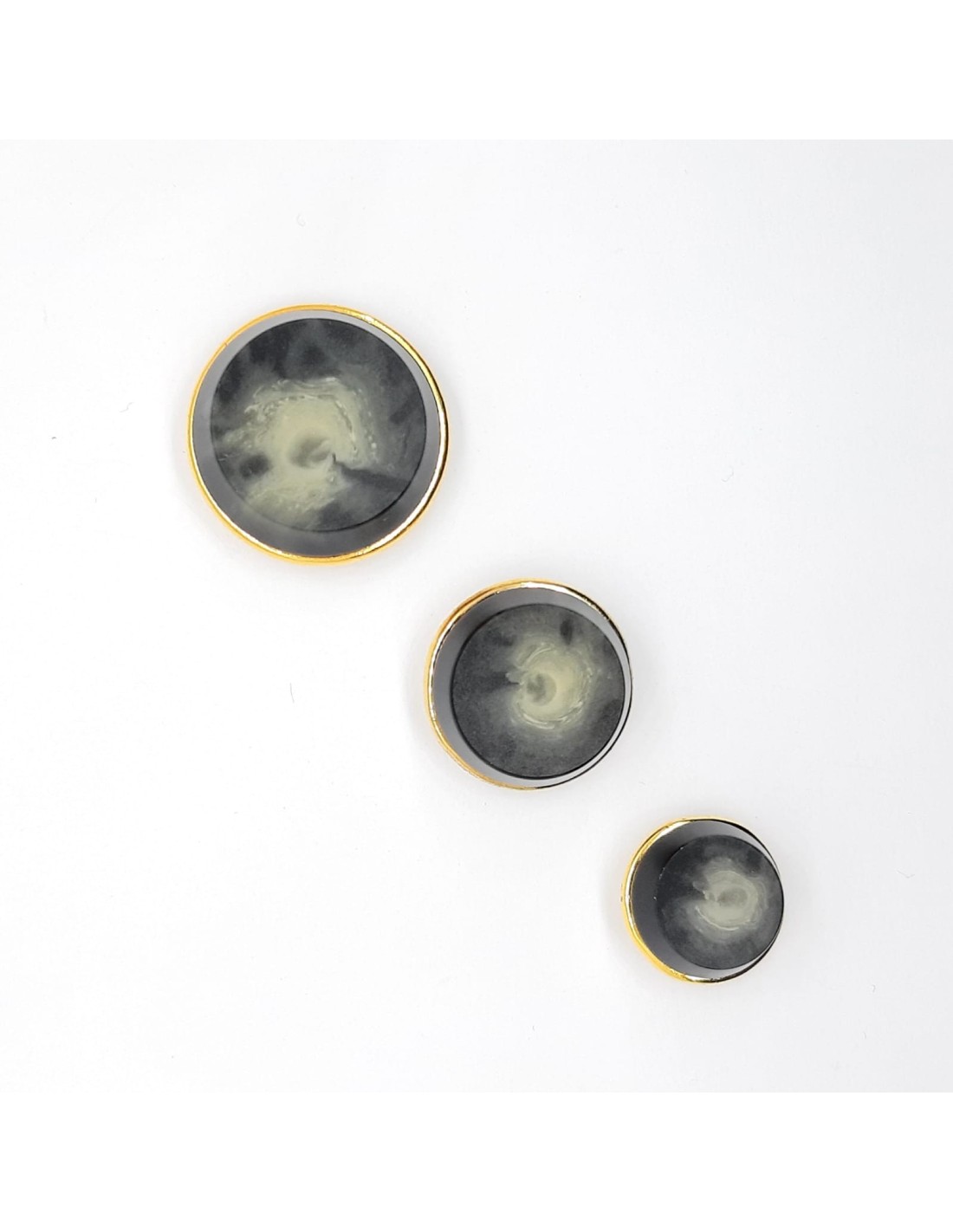 Botón decorativo con pie gris marengo mezcla mate y filo dorado de 5mm de grosor.