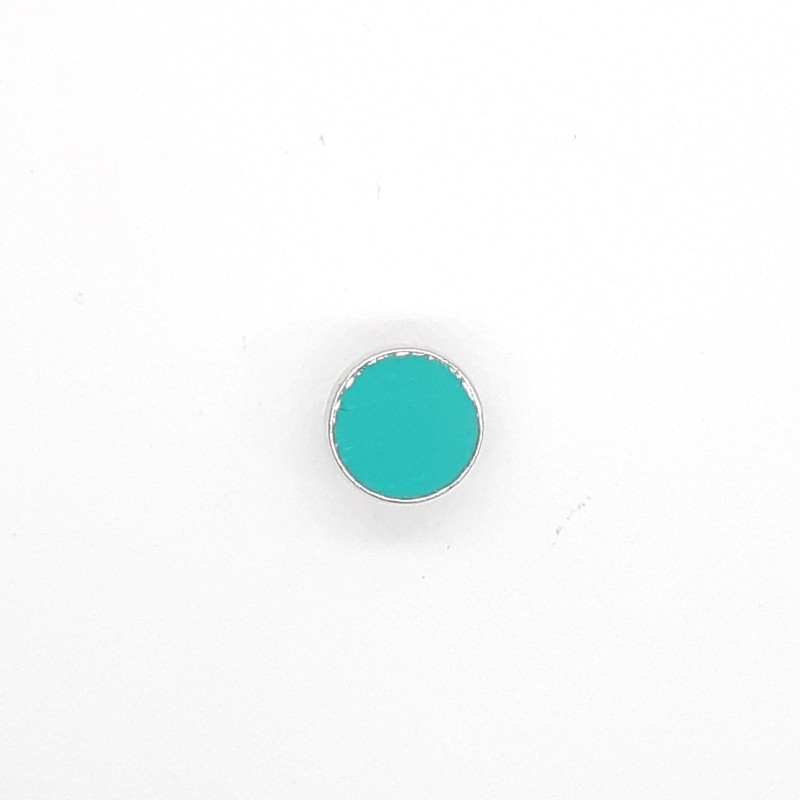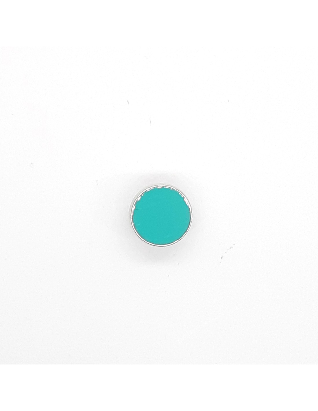 Botón esmaltado de color con filo decorativo plateado con pie. Botón camisero de tamaño 16 cosido por atrás. Fabricación Nacional.