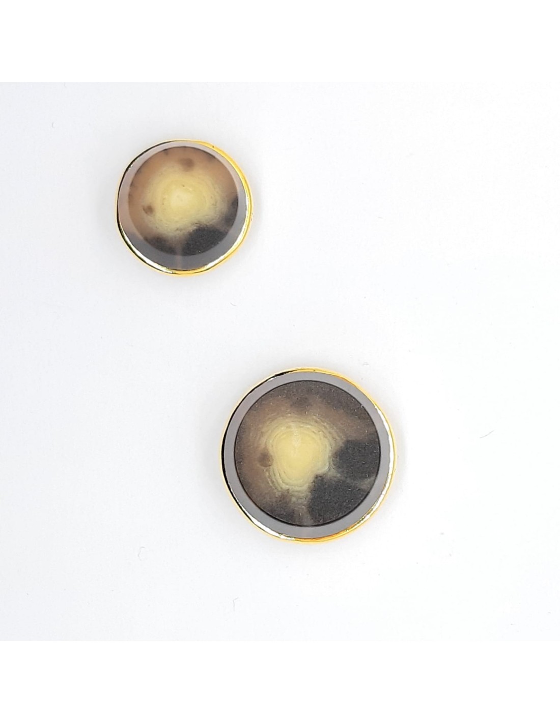 Botón decorativo con pie marrón mezcla mate y filo dorado.