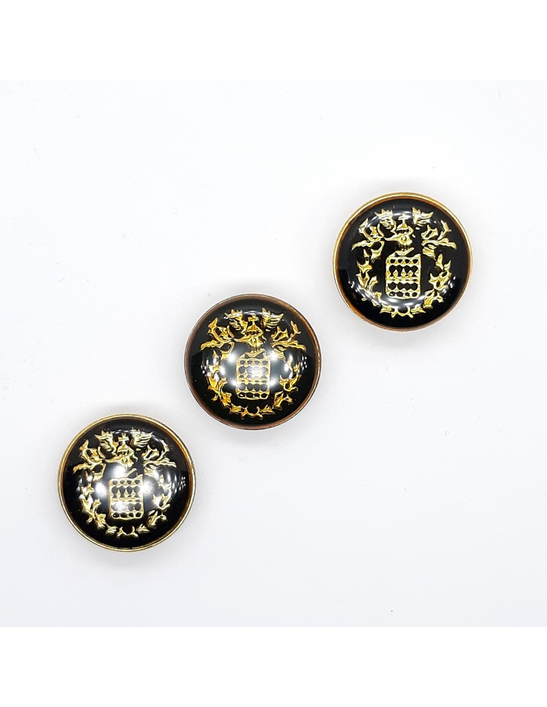 Botón metálico filo dorado con escudo decorativo y fondo negro de 2 cms.