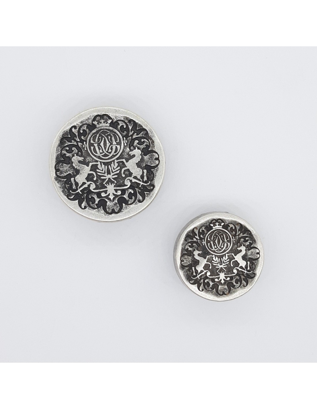 Botones metálicos con diseño de escudo y caballos. Botón metálico plata vieja especial para chaquetas de diseño, jinete, amazona, caballista... Se recomienda coser los botones metálicos con hilo de torzal para una mejor sujeción.