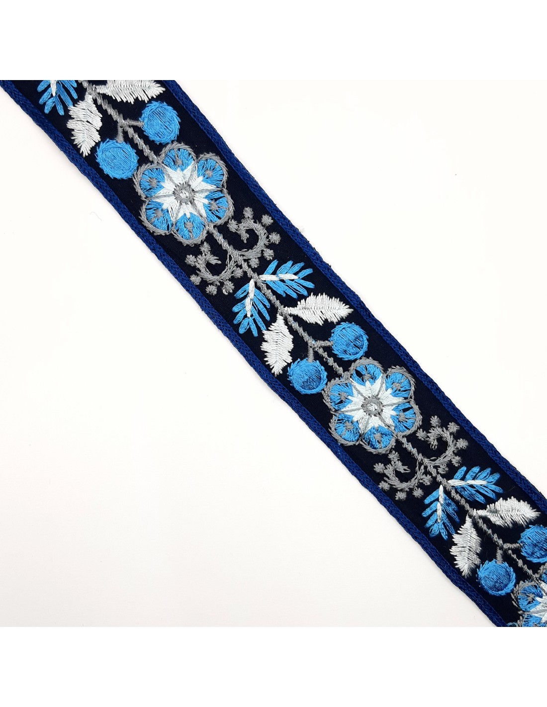Galón tapacosturas cubrecosturas azul marino con flores bordadas 3,5 cms