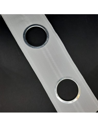 Cinta blanca para cortinas con ollaos de 32 mm de color níquel. Distancia entre ellos 76 mm.