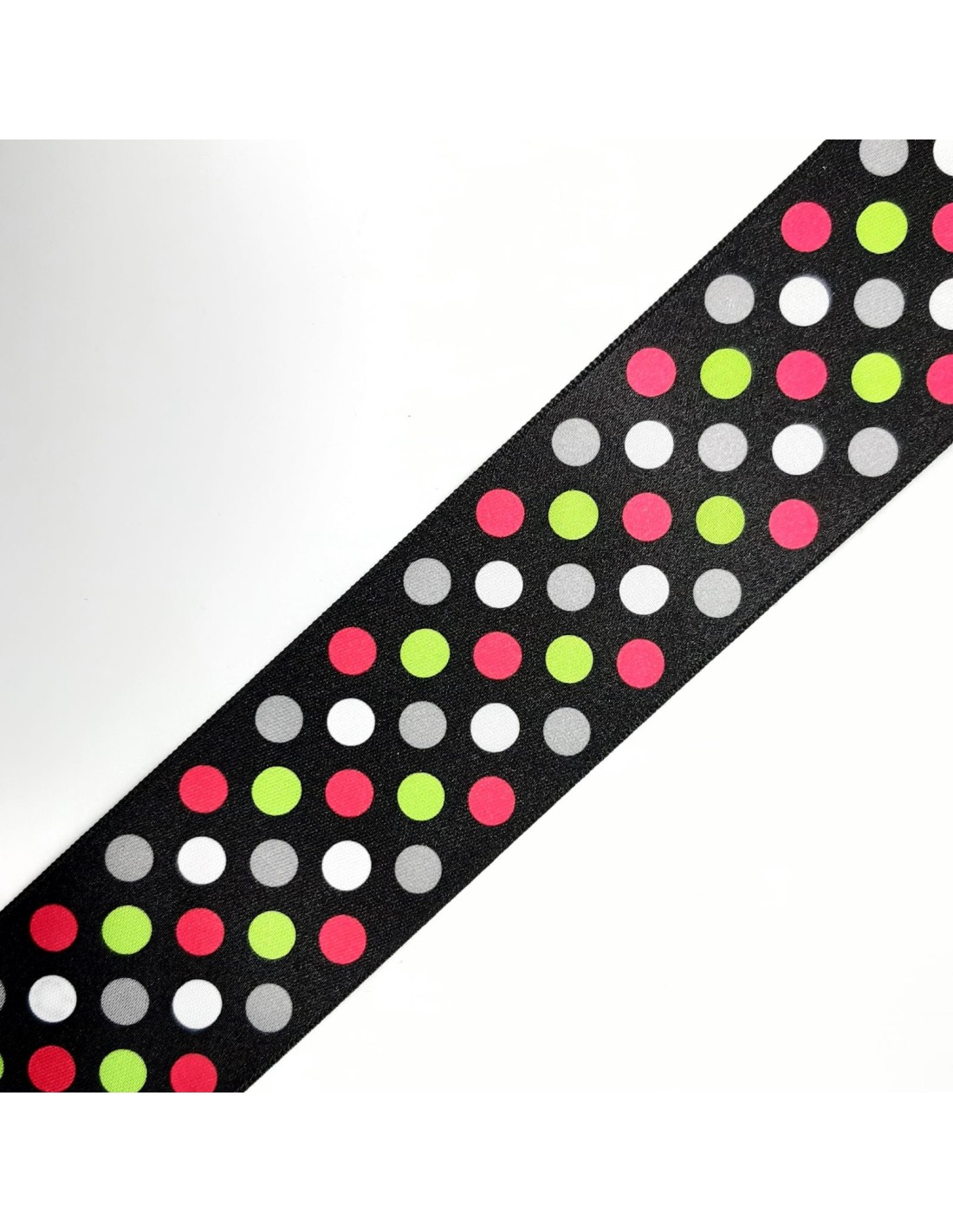 Cinta satén fantasía de fondo negro con lunares de 48 mm. Cinta estampada a dos caras con lunares blancos, grises, fucsias y verdes. Fabricación nacional.