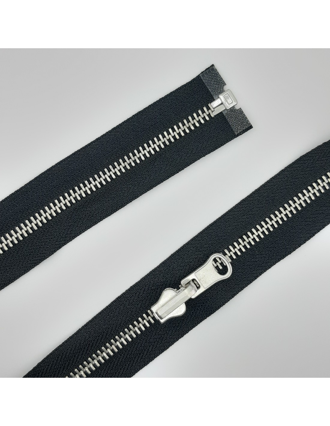 Cremallera reversible metálica separador malla plateada número 5 en color negra.