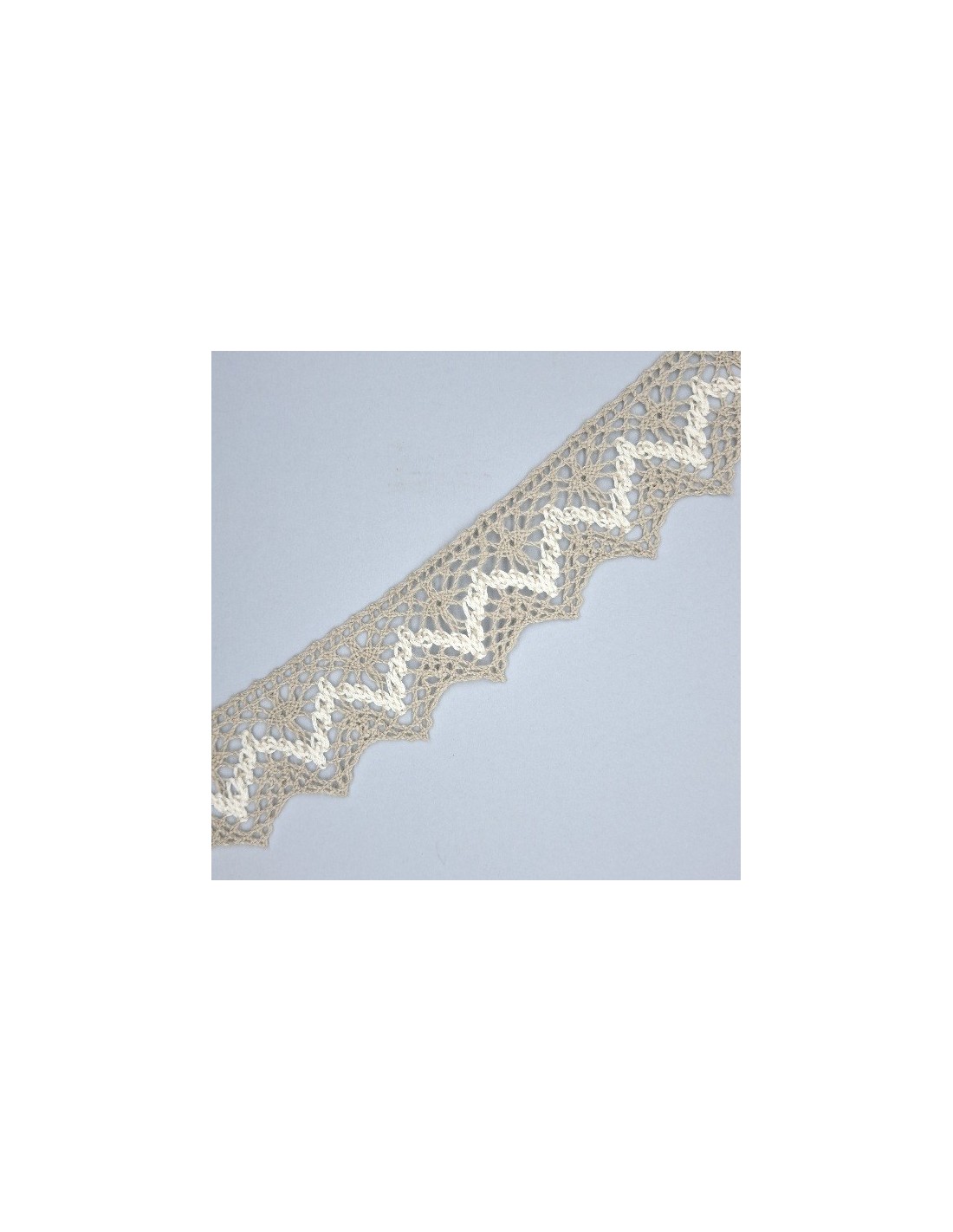 Añade un toque de distinción orgánica a tus proyectos con nuestra puntilla de encaje de bolillo bicolor. Confeccionada en una armoniosa combinación de tonos lino natural y crudo, esta pieza de 40 mm de ancho destaca por su diseño geométrico en zigzag que aporta relieve y textura.