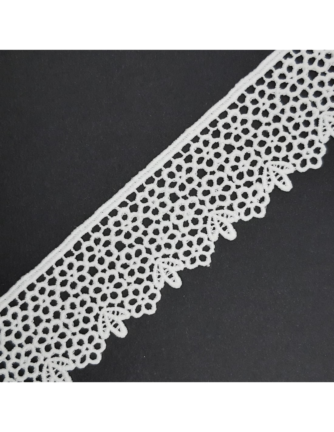 Encaje guipur ideal para adornar prendas de vestir, complementos infantiles y decoración del hogar. Pieza versátil para darle a tus prendas y complementos unos diseños que otorgan volumen y elegancia. Este adorno queda perfecto en complementos o prendas tanto de fiesta como casual, con unos resultados distinguidos y exclusivos.