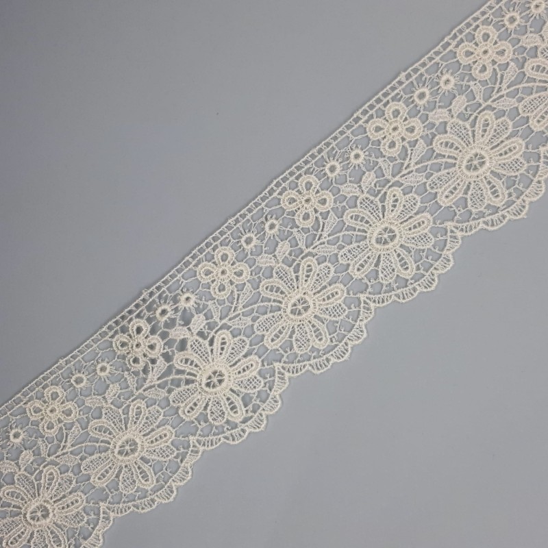 Encaje guipur ideal para adornar prendas de vestir, prendas y complementos infantiles y decoración del hogar. Pieza versátil para darle a tus prendas y complementos unos diseños que otorgan volumen y elegancia. Este adorno queda perfecto en complementos o prendas tanto de fiesta como casual, con unos resultados distinguidos y exclusivos. Muy utilizado en trajes de flamenca y regionales.