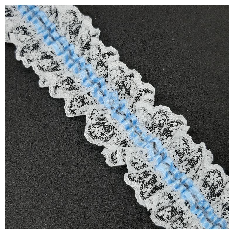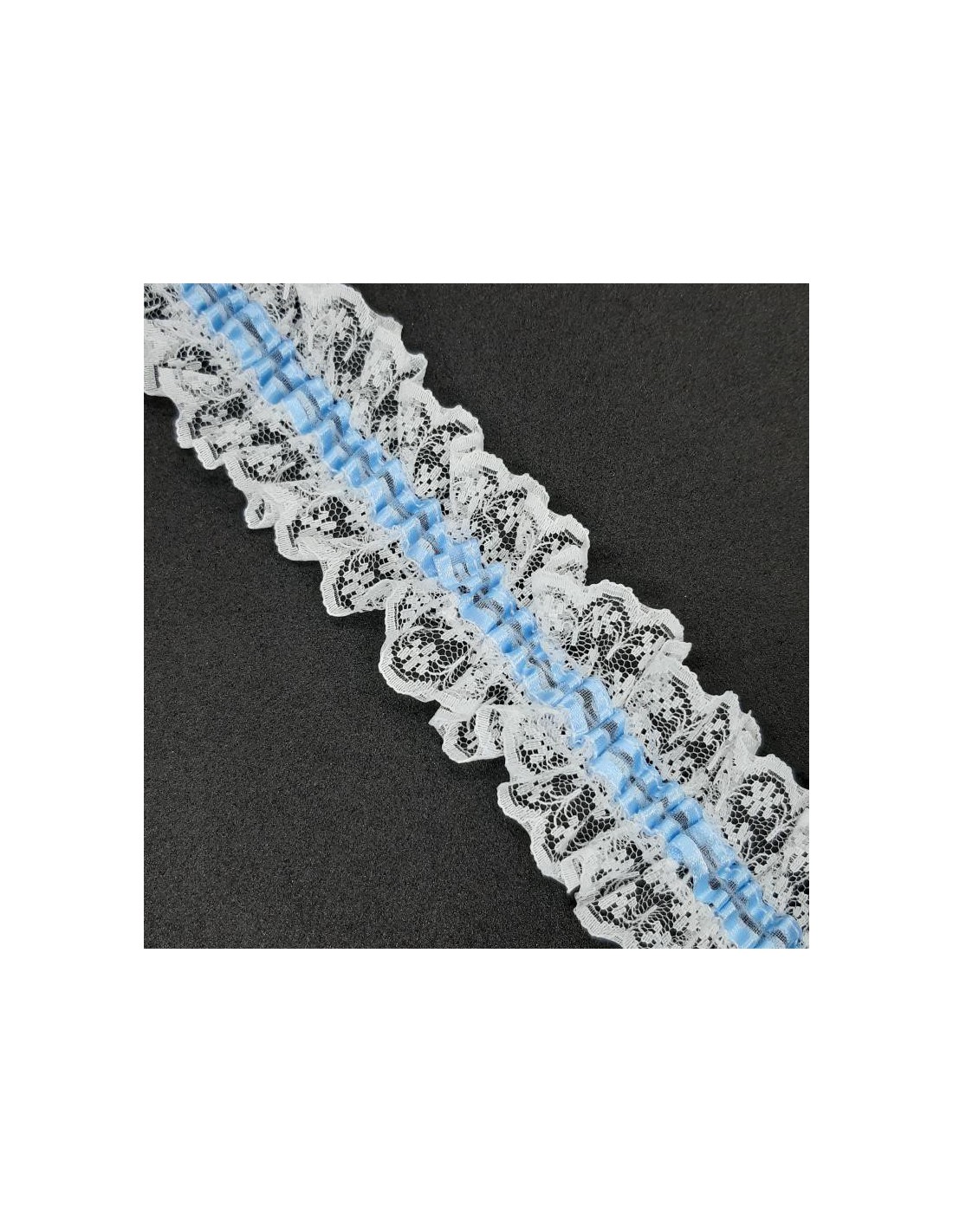Encaje elástico blanco de 4 cms con lazo celeste rizado. Especial para ligas de novias.