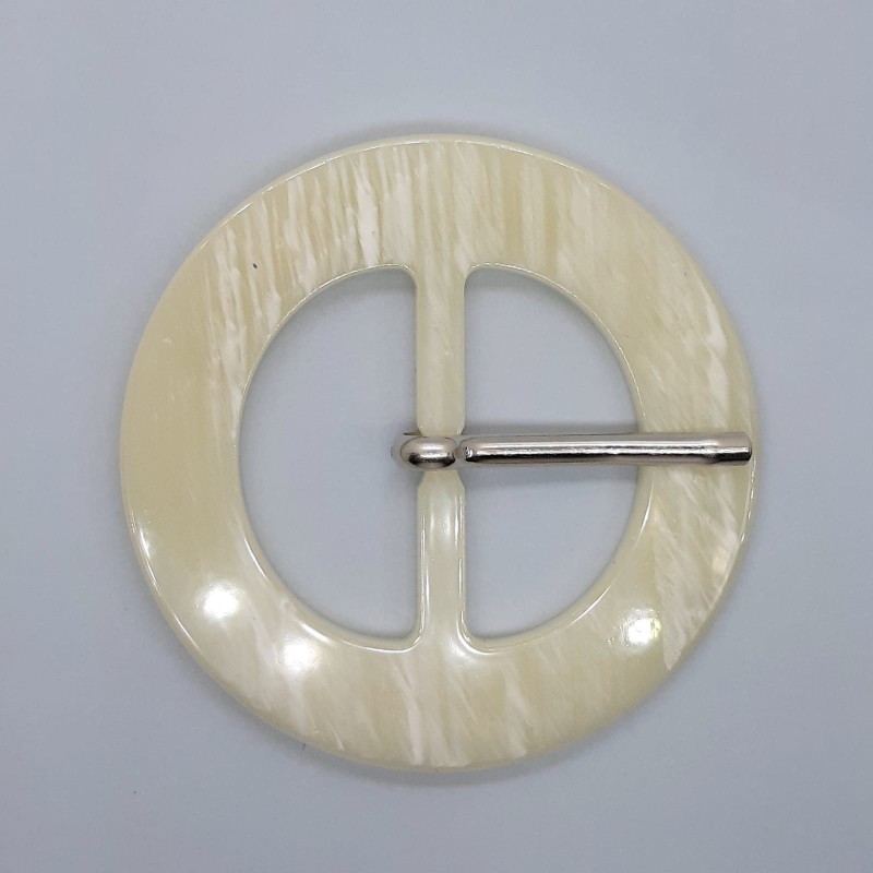 Hebilla acrílica circular jaspeada. Medidas: 40 mm interior y 75 mm exterior.