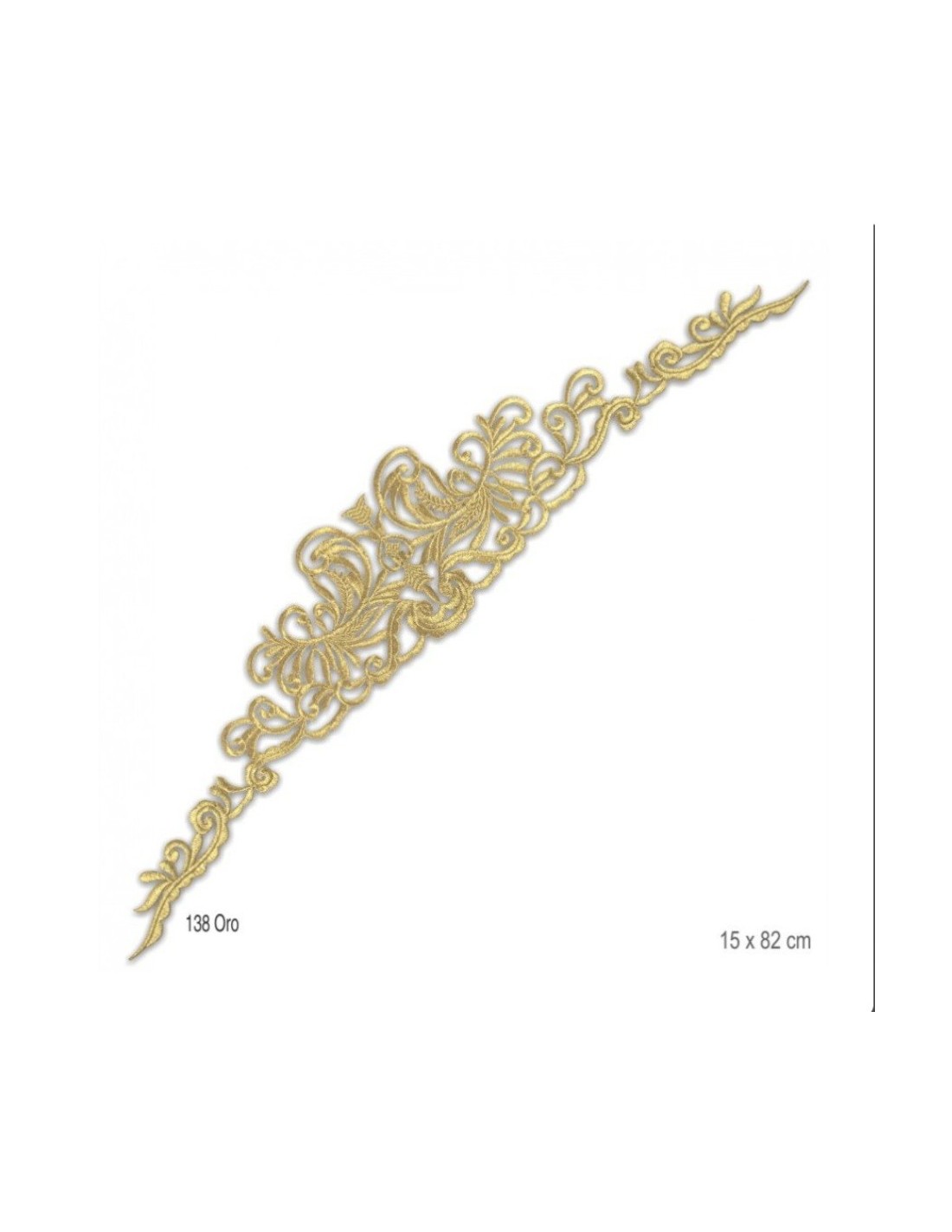 Aplique bordado termoadhesivo clásico y elegante, realzado por un acabado dorado metalizado que irradia calidez y solemnidad. Especialmente utilizado durante las celebraciones religiosas.