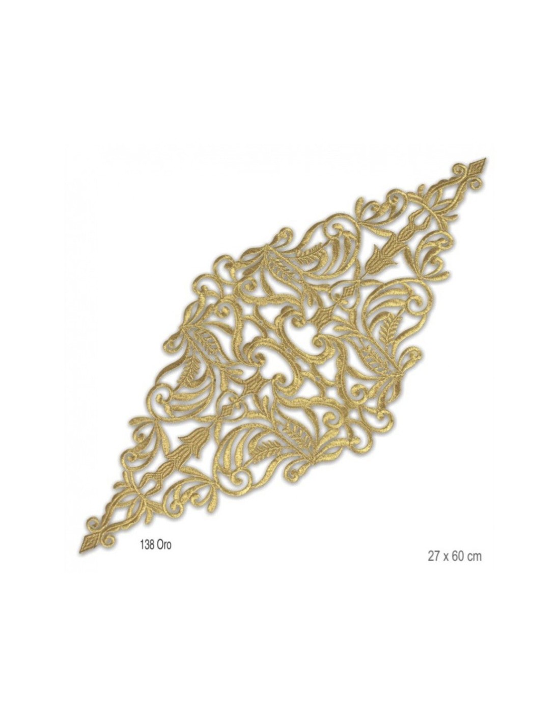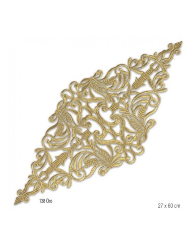 Aplique bordado termoadhesivo clásico y elegante, realzado por un acabado dorado metalizado que irradia calidez y solemnidad. Especialmente utilizado durante las celebraciones religiosas.