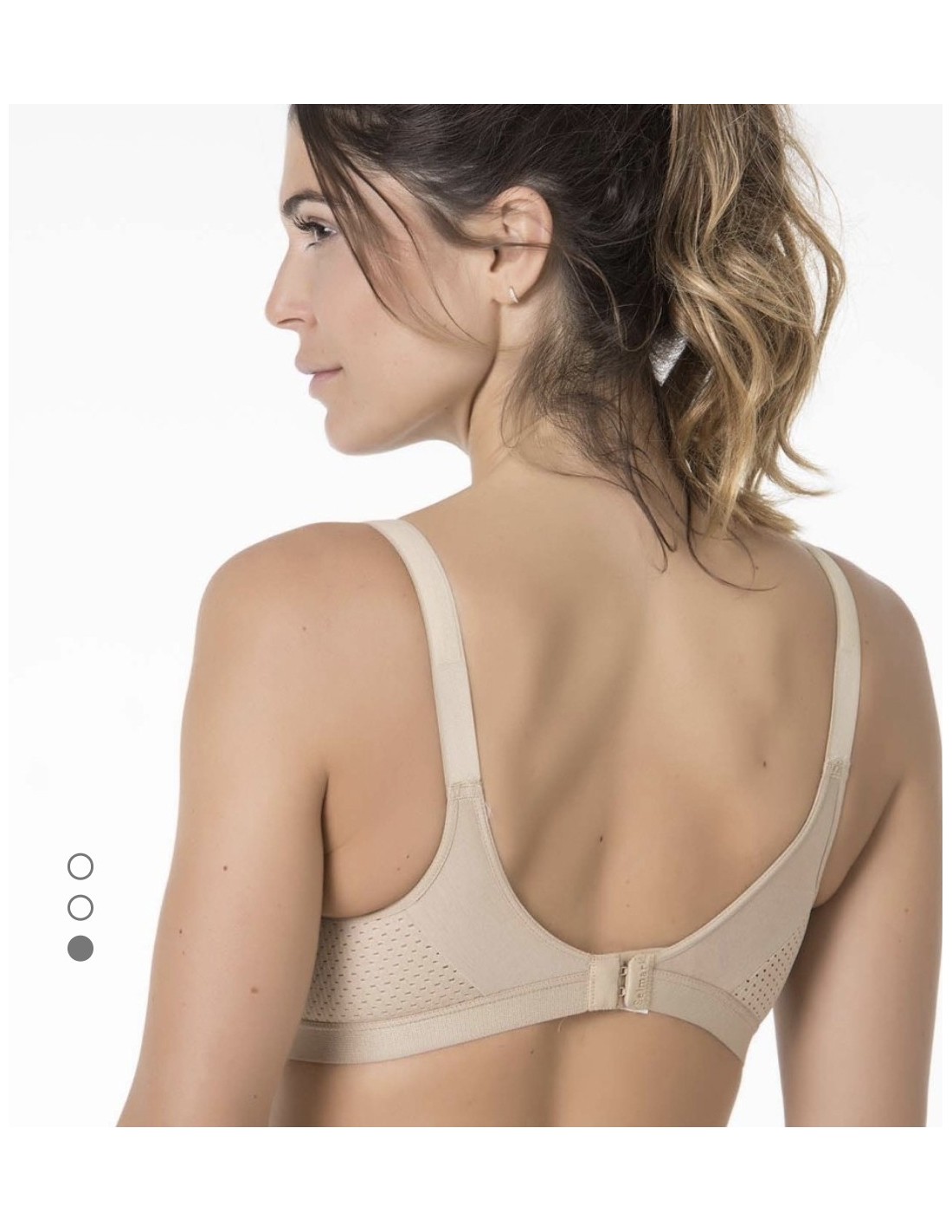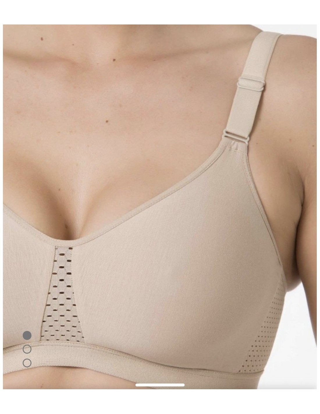 Sujetador hipoalergénico de presión ligera. Adecuado para postoperatorio, que no requiera prótesis, y para procesos de radioterapia que lesionan de forma agresiva la piel de la paciente. Este sujetador está desarrollado con materiales naturales hipoalergénicos para sentir un máximo confort al contacto con la piel. Tejido doble prehormado de algodón, con tirante acolchado de ajuste delantero. Laterales con malla abierta transpirable. De color piel y negro.