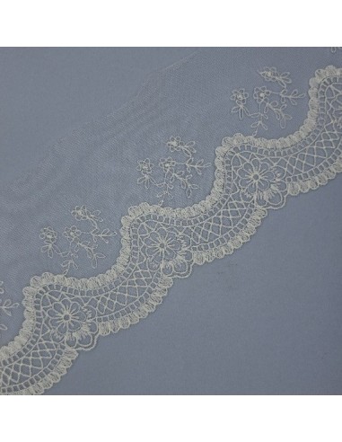 Puntilla de Encaje de Tul Bordado en un suave tono beige (o crudo/natural). Esta puntilla es la elección perfecta para quienes buscan añadir un detalle de máxima sofisticación y delicadeza a cualquier proyecto de costura.