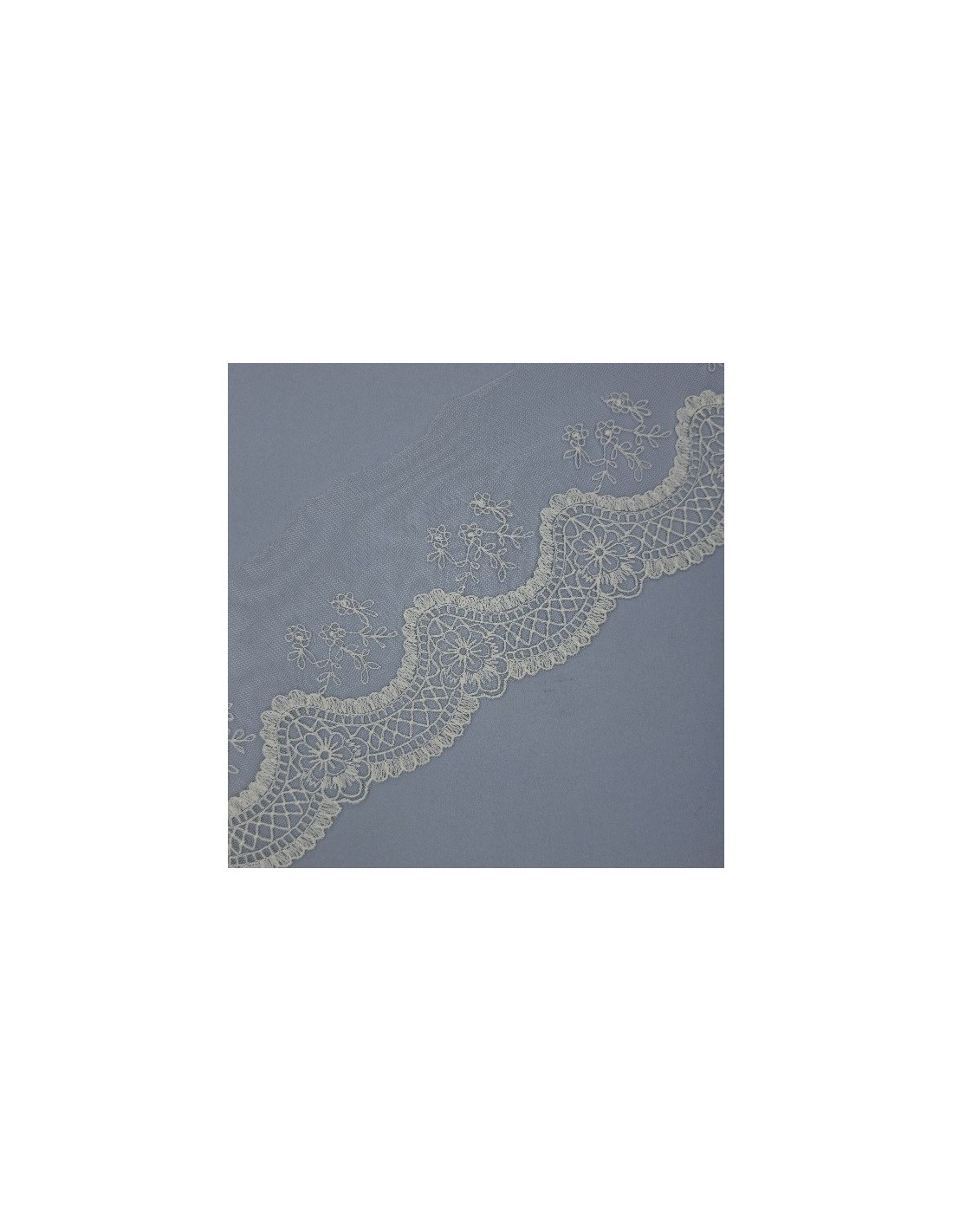 Confeccionada sobre una base de tul ligero, presenta un bordado floral intrincado y un patrón ondulado en el borde que evoca el encaje clásico. Su diseño detallado y su color neutro la hacen increíblemente versátil, ideal para: