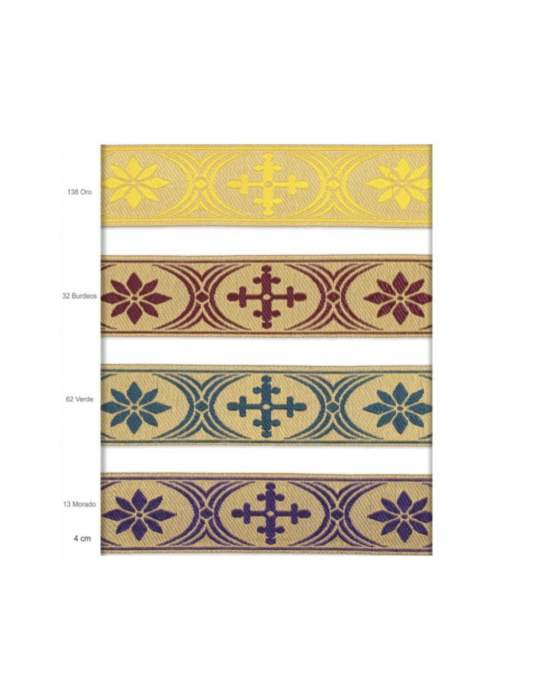 En Mercería Alfambra, presentamos nuestro exclusivo galón tejido de 4 cm, diseñado específicamente para proyectos que requieren una simbología profunda. Este galón combina el fondo dorado con un motivo central de cruces bordadas en color, creando una pieza de gran valor visual y espiritual.