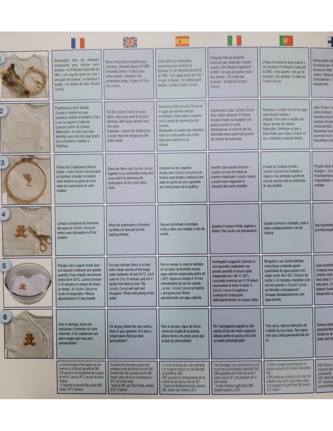 Tela ideal para personalizar cualquier prenda en punto de cruz. Una vez terminado el bordado, cortar y retirar con cuidado el hilo del bordado. Poner en remojo el soporte bordado en un cubo que contenga agua caliente enjabonada ( entre 40 y 50 grados ). Dejar en remojo 5-10 minutos removiendo de vez en cuando y la tela soluble desaparecerá. Aclarar abundantemente con agua caliente.