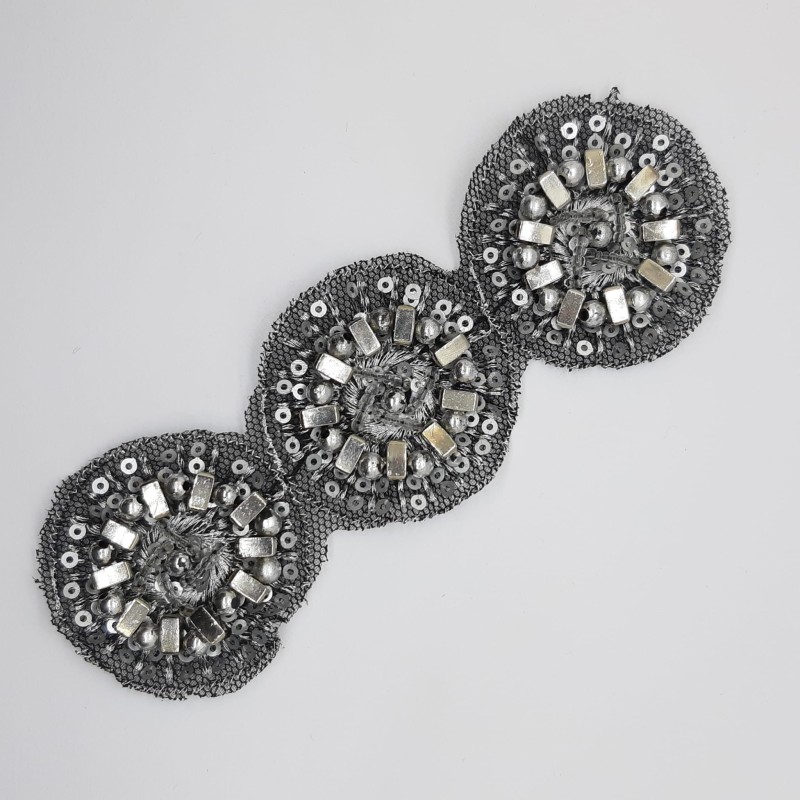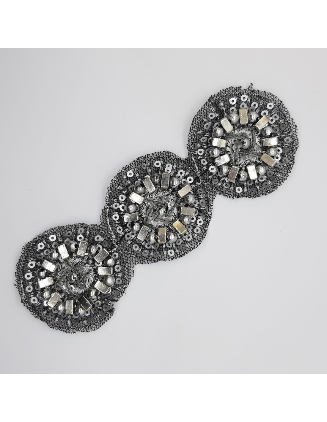 Aplique fantasía con circulos y piedras de tonos plata vieja. Adorno ideal para darle a tus prendas y complementos un toque único y personal. Quedando un diseño fino y elegante que no te puede faltar. Muy utilizado en artículos de fiesta como bolsos, cinturones,... pieza versátil con muchísimas funciones decorativas.