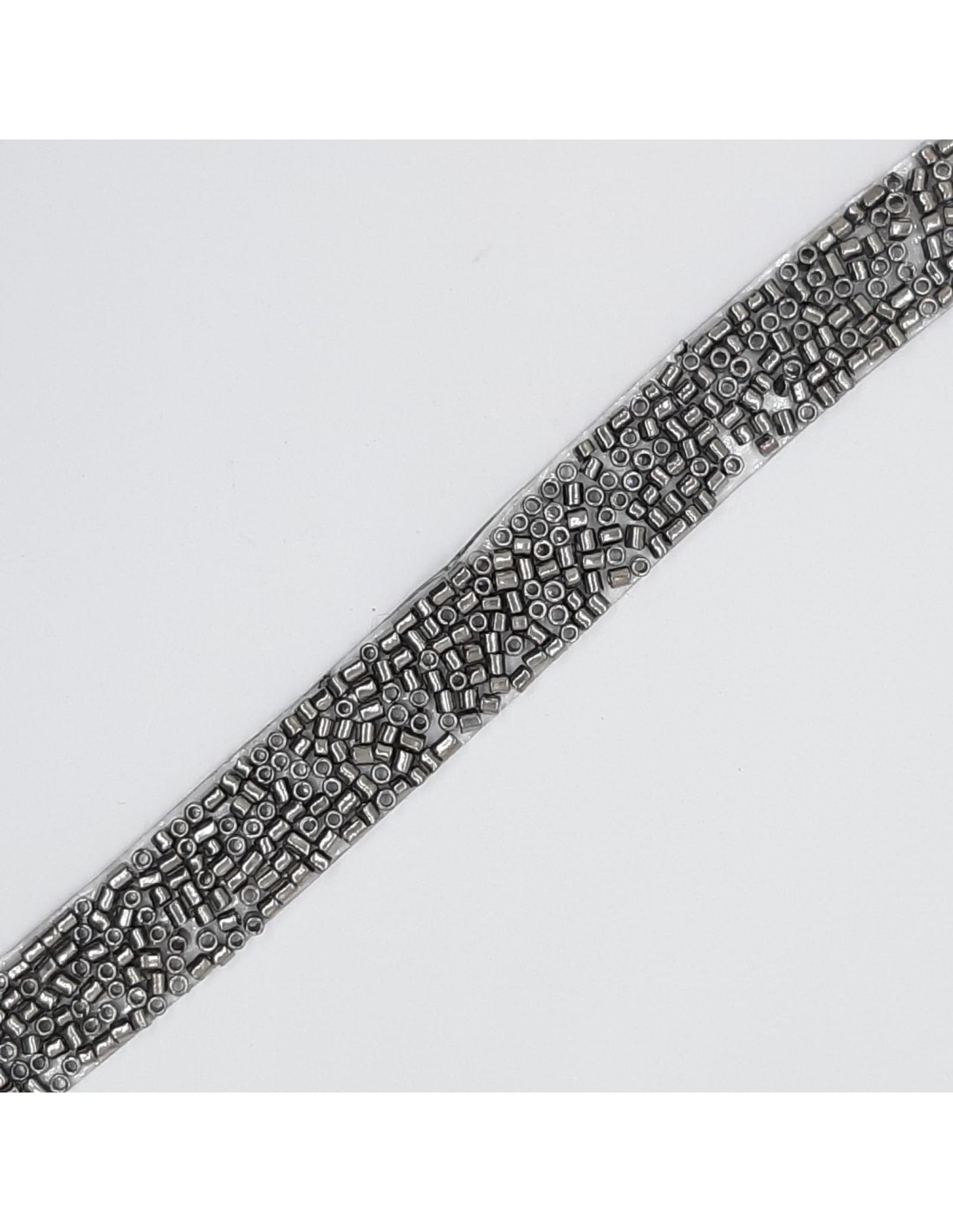 Pasamanería de 1 cm con tubitos decorativos de color plata vieja.