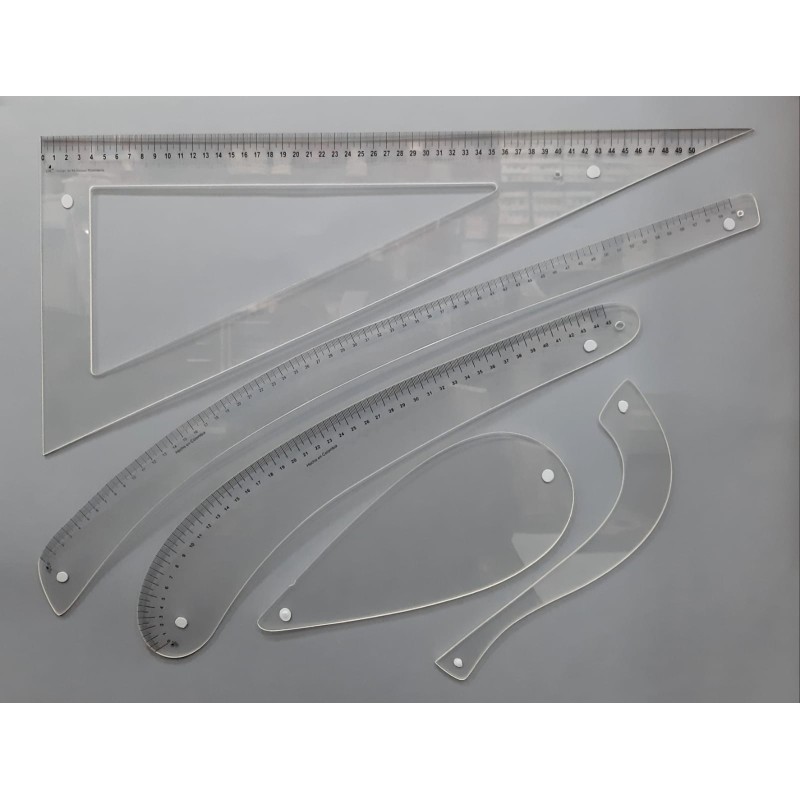 Juego de reglas especiales para patronaje y confección. Conjunto de 5 piezas fabricadas en material acrílico transparente.