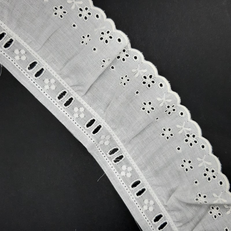 Tira bordada fruncida con pasacinta POL/ALG blanca de 6,5 cms
