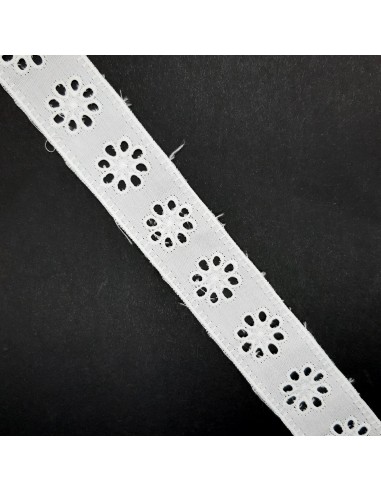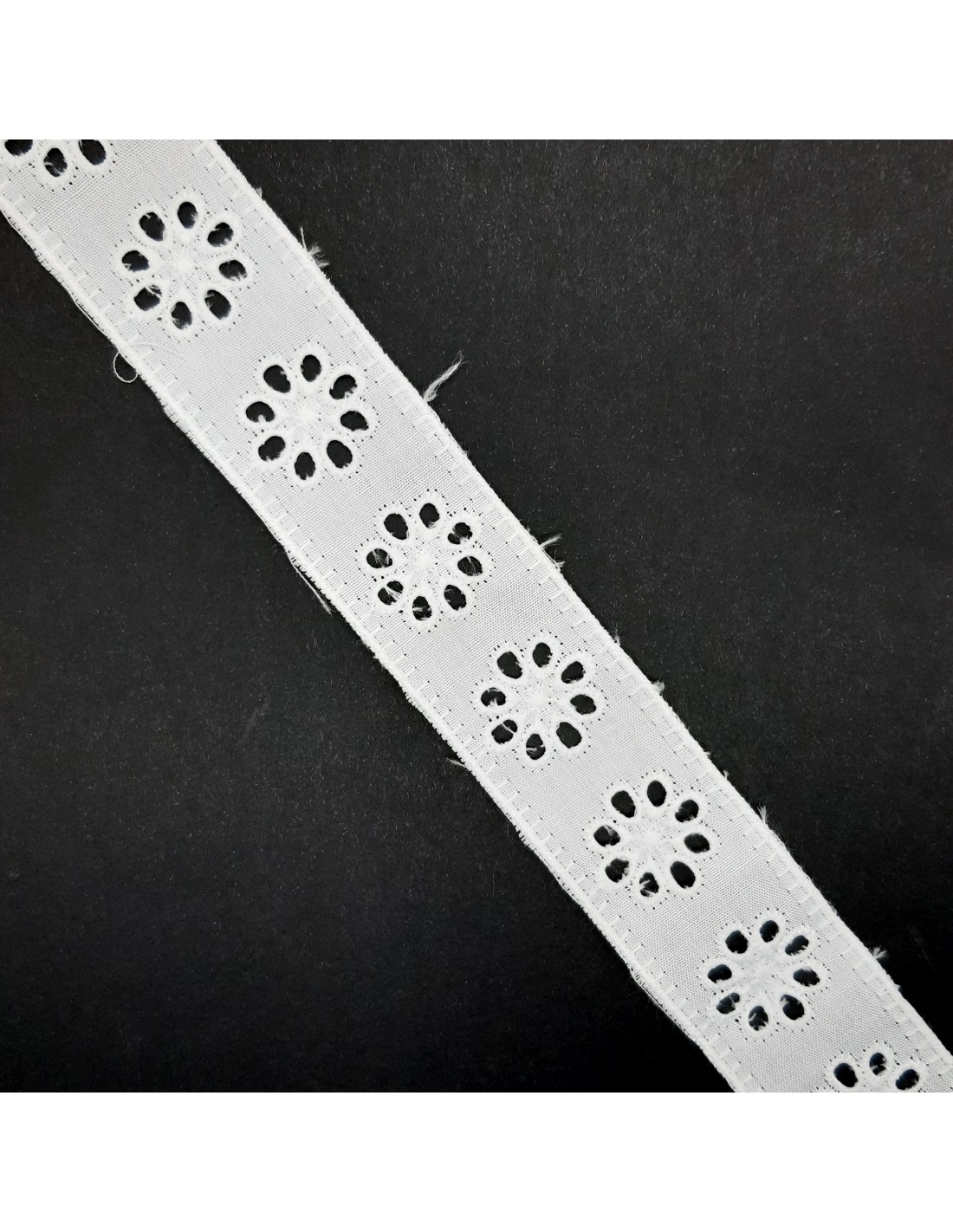Tira bordada de diseño clásico con pequeñas flores perforadas decorativas. Adorno versátil para un sinfín de proyectos decorativos. Especial para prendas y complementos del hogar, como juegos de sábanas y toallas, cortinas, manteles, prendas infantiles, cestas, manualidades,... y para muchos más trabajos, dándoles un toque único y personal.