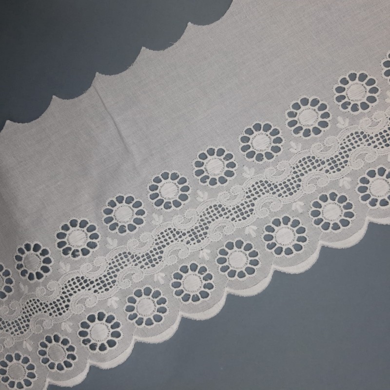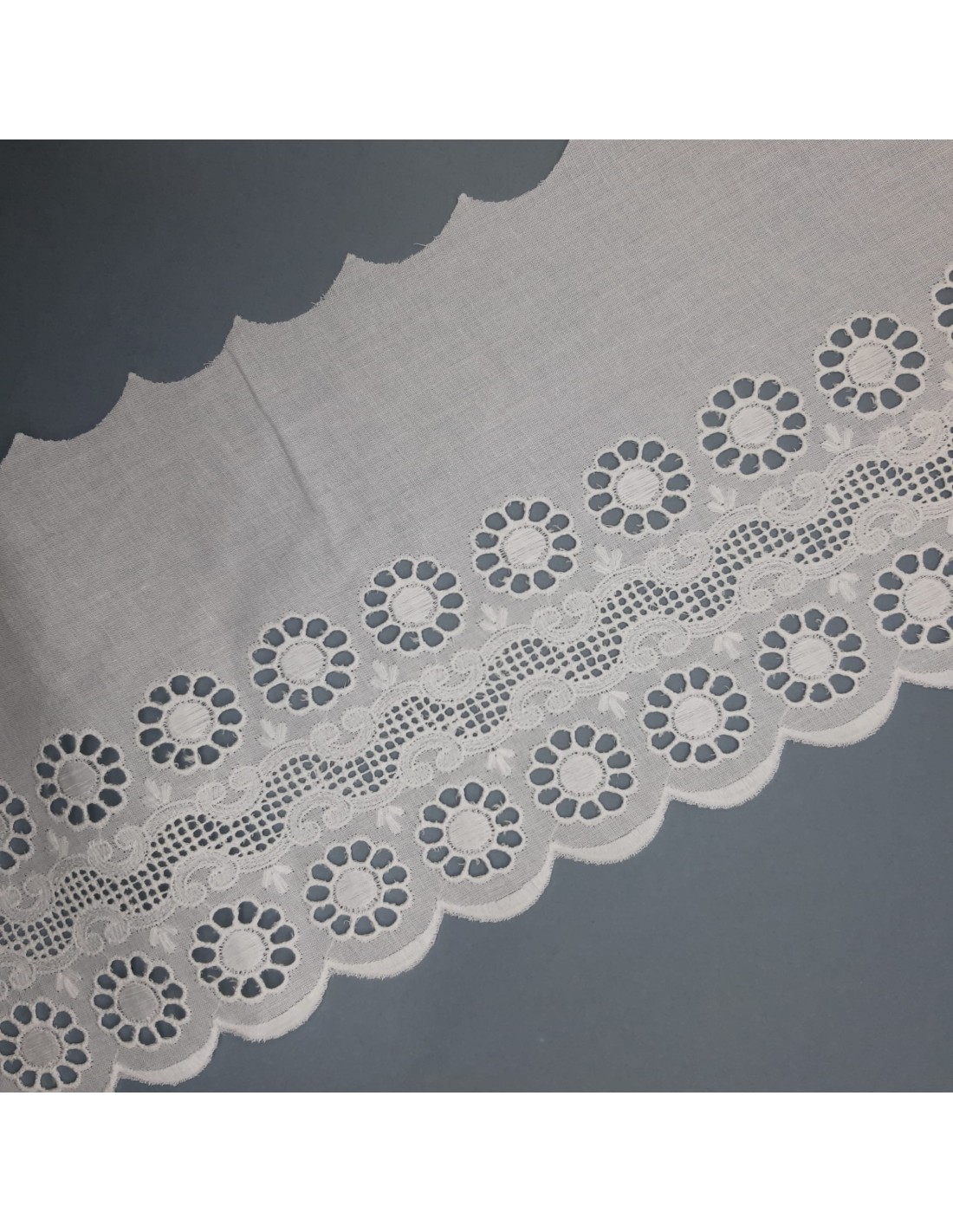 Tira bordada de diseño clásico con pequeñas flores perforados y acabado con ondas decorativas. Adorno versátil para un sinfín de proyectos decorativos. Especial para prendas y complementos del hogar, como juegos de sábanas y toallas, cortinas, manteles, prendas infantiles, cestas, manualidades,... y para muchos más trabajos, dándoles un toque único y personal.