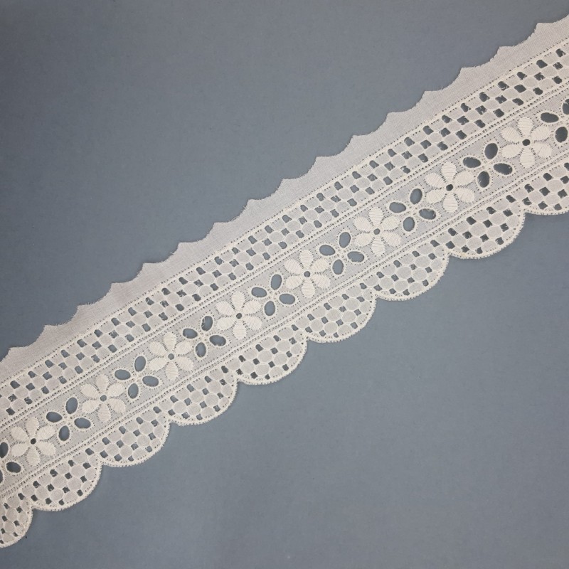 Tira bordada de diseño clásico con pequeñas flores perforados y acabado con ondas decorativas. Adorno versátil para un sinfín de proyectos decorativos. Especial para prendas y complementos del hogar, como juegos de sábanas y toallas, cortinas, manteles, prendas infantiles, cestas, manualidades,... y para muchos más trabajos, dándoles un toque único y personal.